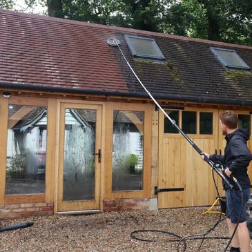 Main roof and outhouses fully cleaned, finished with a biocide treatment. Thick moss, years of dirt- all gone. Very satisfying.